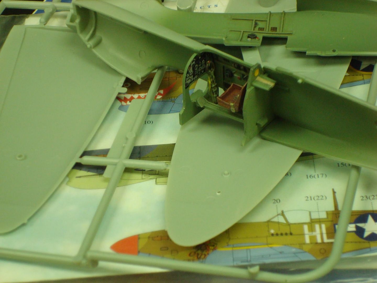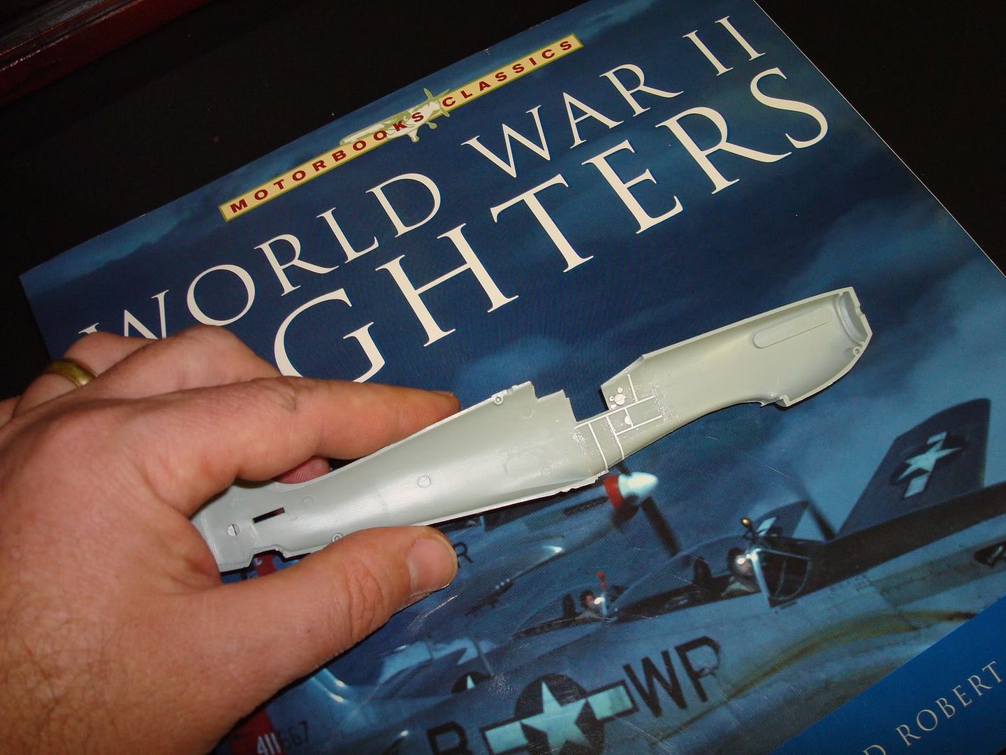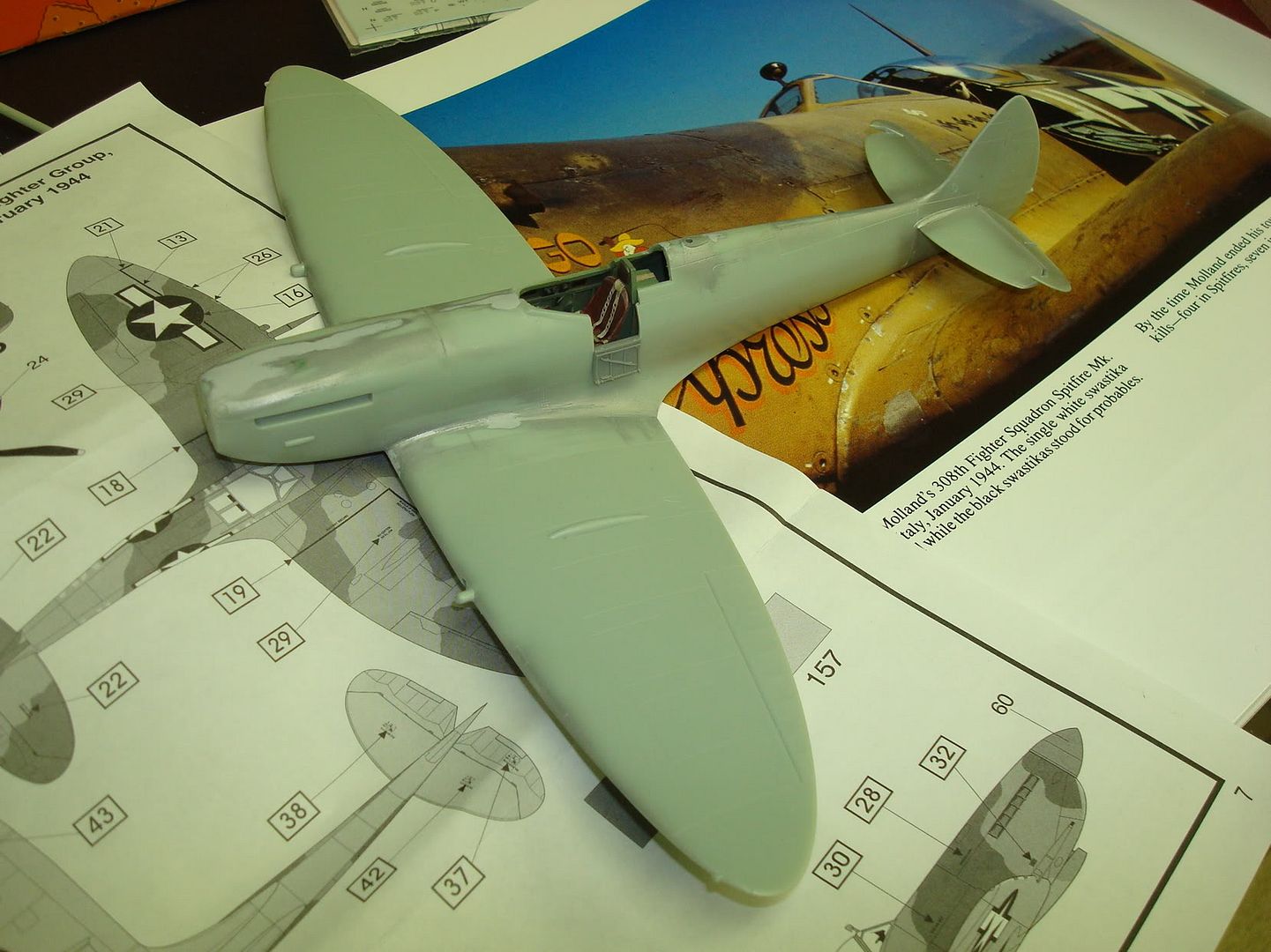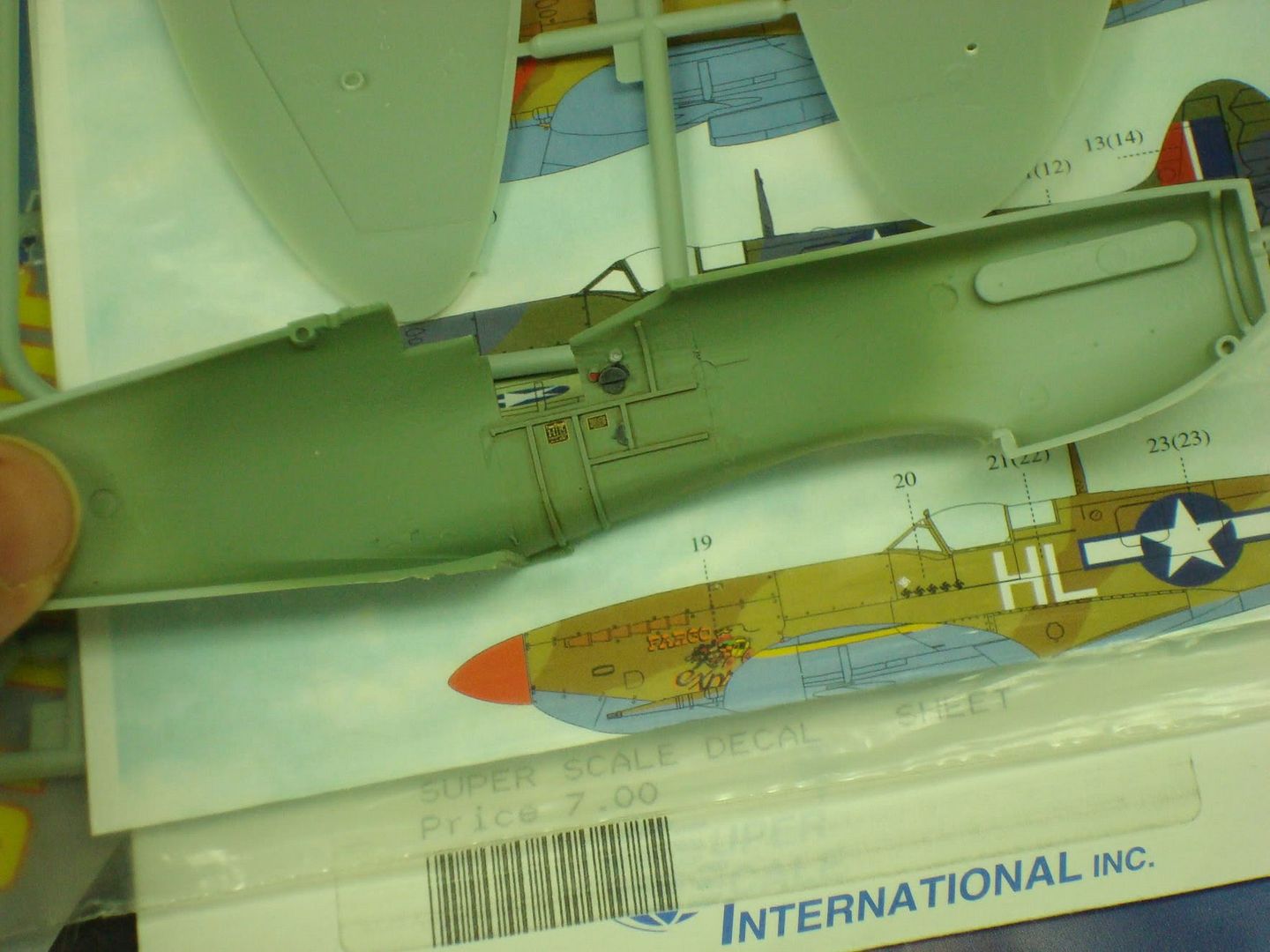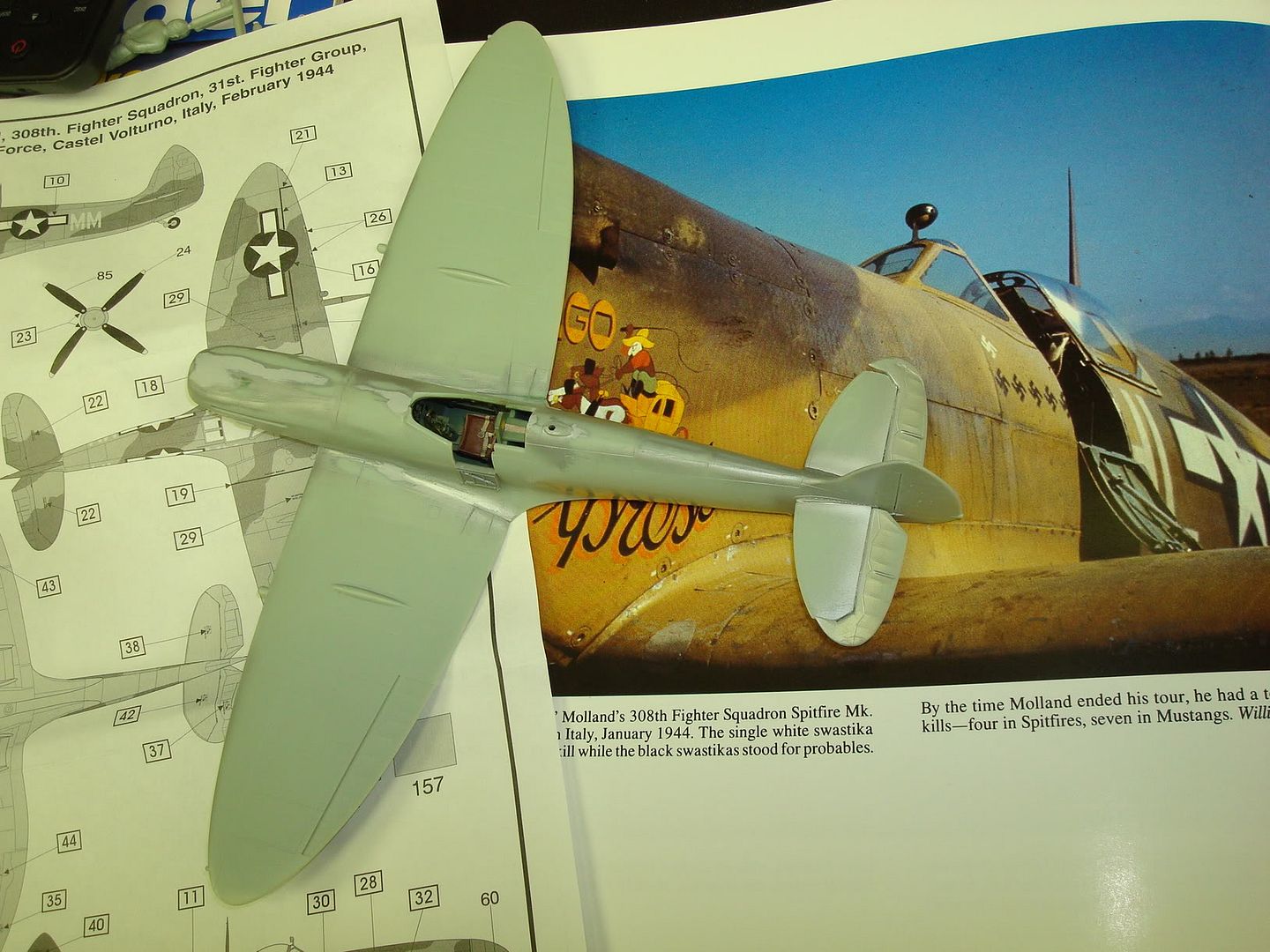 Things were Framed up and seams sanded out.  Elevators were cut out and dropped. The lack of the characteristic gull wing spitifires displayed  on the lower fuse wing trailing edge was just ignored. Tobbacco screens were added to the radiators.  The chin scoop. radiators, and elevators were added, along with a door from the spares box, and its about ready for paint..